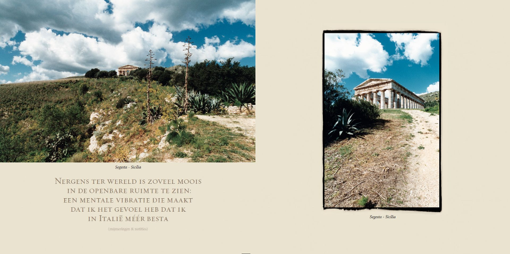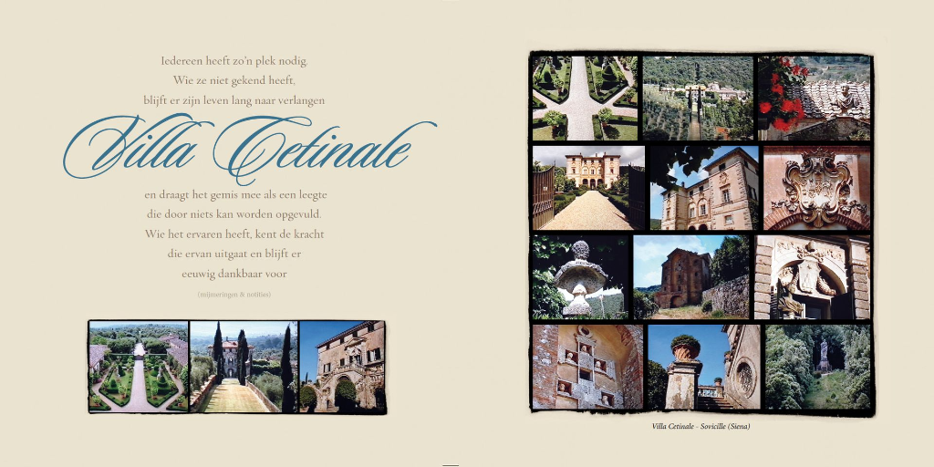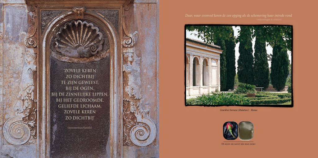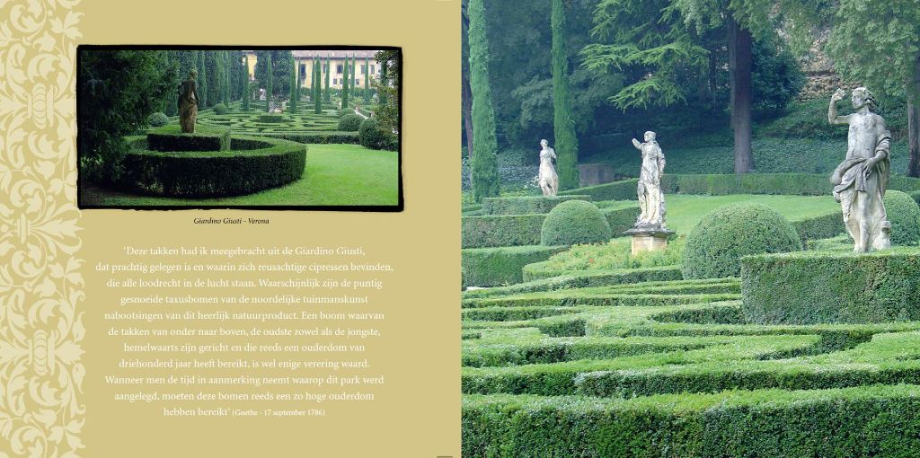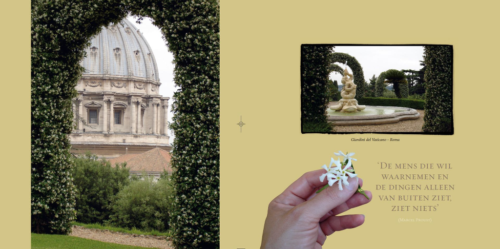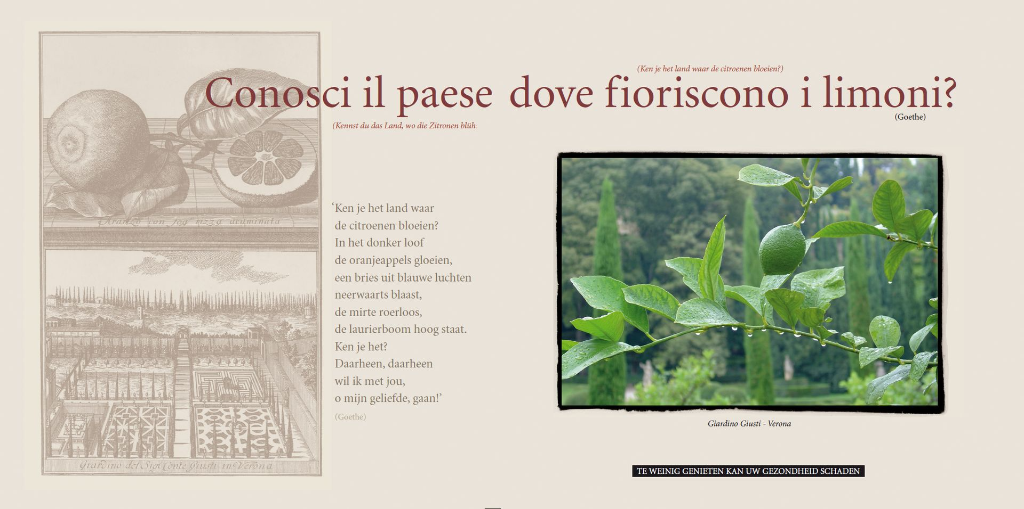 Talrijke foto's van prachtige Italiaanse tuinen vormen het zinnelijke decor voor confrontatie en reflectie.